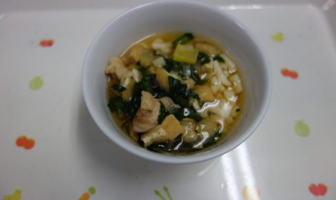 【昼食】 ・五穀ごはん ・かきたま汁 ・豆腐のひき肉みそあんかけ ・のりマヨネーズ 【おやつ】 ・炊き込みピラフ ・甘辛小魚(揚げ) ・牛乳 【離乳食】 ・軟飯 ・すまし汁 ・豆腐のみそあんかけ ・キャベツの煮びたし